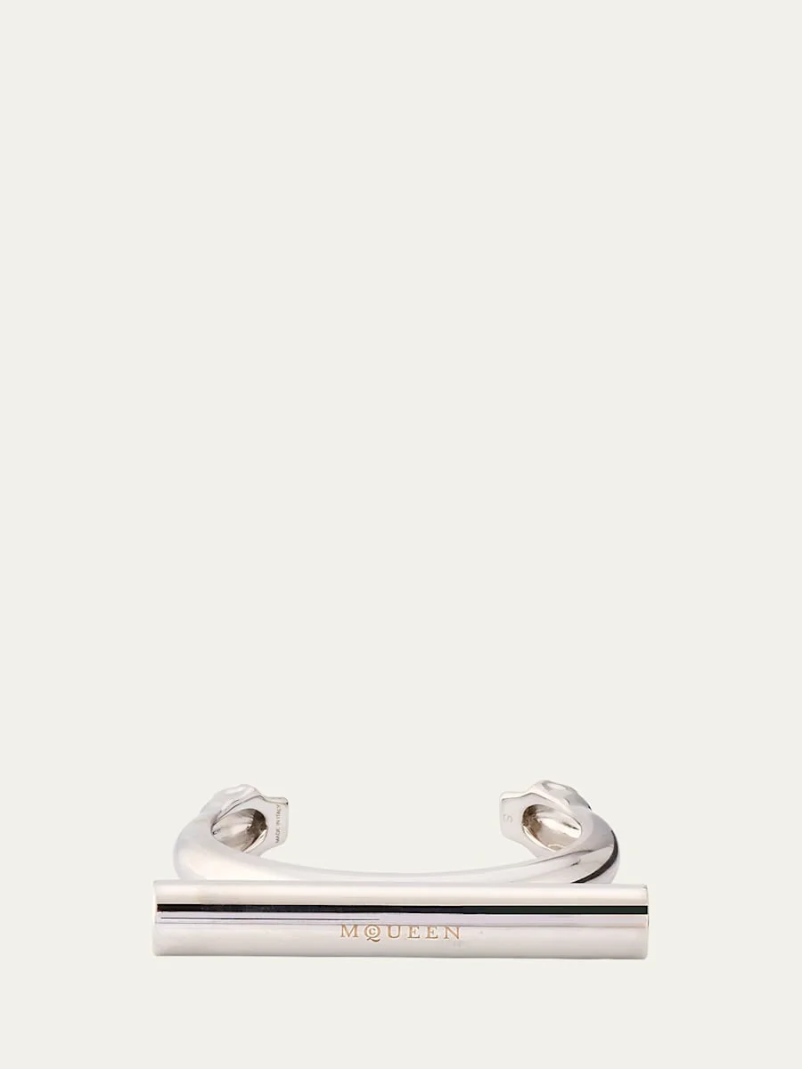 Alexander McQueen cuff bracelet featuring a statement cross-bar with an engraved logo and skull detailing Brass in a palladium finish Open back Made in Italy Online Inquiries: BGS21_Y7ASN| Store Inquiries: #4894101