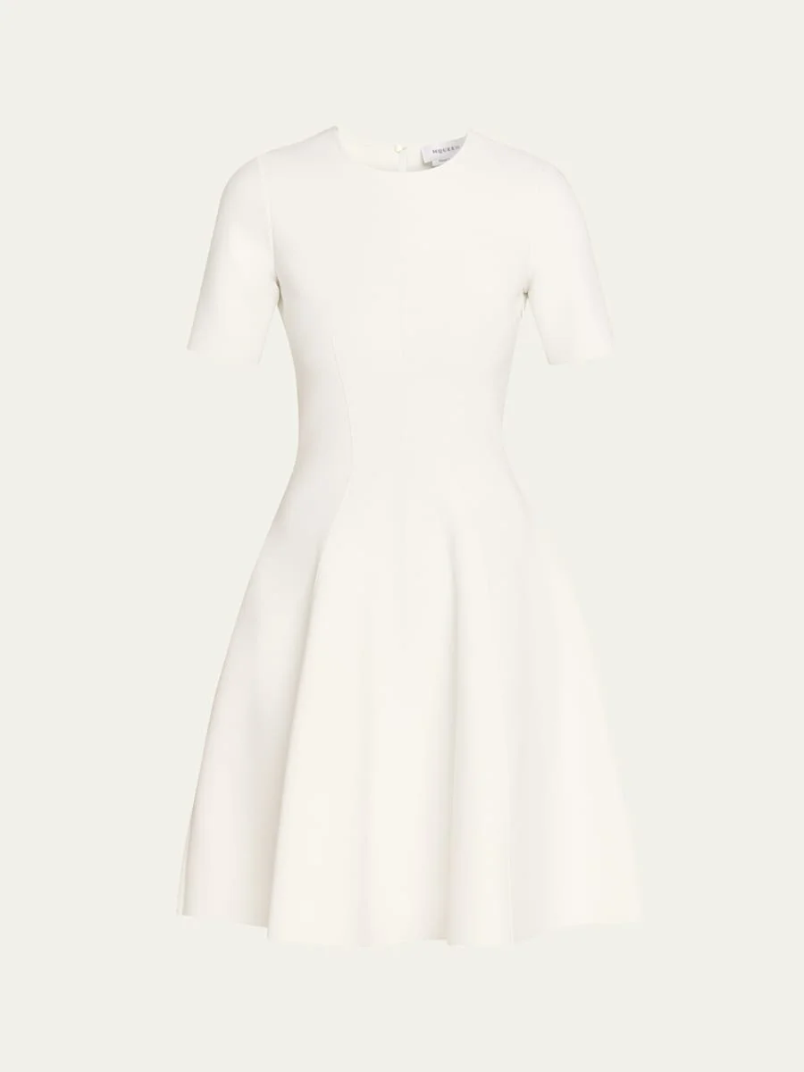 McQueen dress is structured with contouring waist seams Round neckline Short sleeves Fit-and-flare silhouette Mini length Button/keyhole back Viscose/polyester/mother-of-pearl Made in Italy Online Inquiries: BGS21_BA7S4| Store Inquiries: #5046815