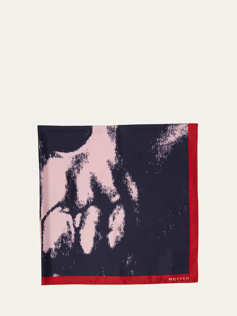 McQueen silk shawl with exploded skull motif Approx. 54"L x 54.0"W Logo at hem Contrast trim Can be styled multiple ways Silk Dry clean Made in Italy