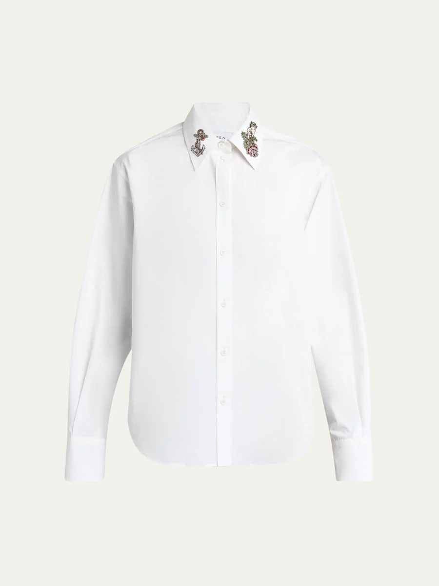 McQueen poplin shirt featuring a strass embellished anchor embroidered collar detail Point collar; button front Long sleeves; button cuffs Loose fit Shirttail hem Cotton Made in Italy Online Inquiries: BGS21_BA7RQ| Store Inquiries: #5046800