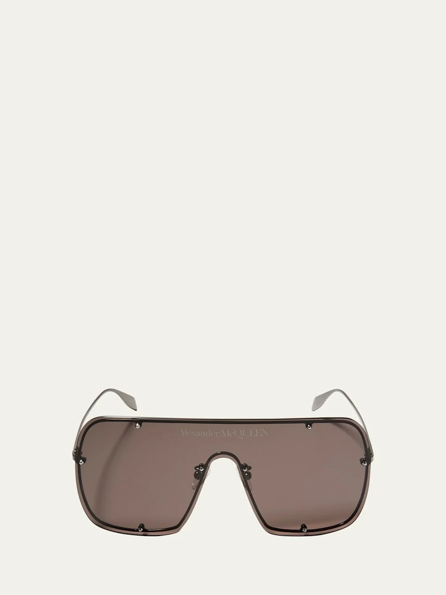 Alexander McQueen shield sunglasses in metal Solid-color lenses with logo across front; studded trim Adjustable nose pads Engraved logo on temples Thin, tapered arms 100% UVA/UVB protection Made in Italy Online Inquiries: BGS21_D44QX| Store Inquiries: #4225682