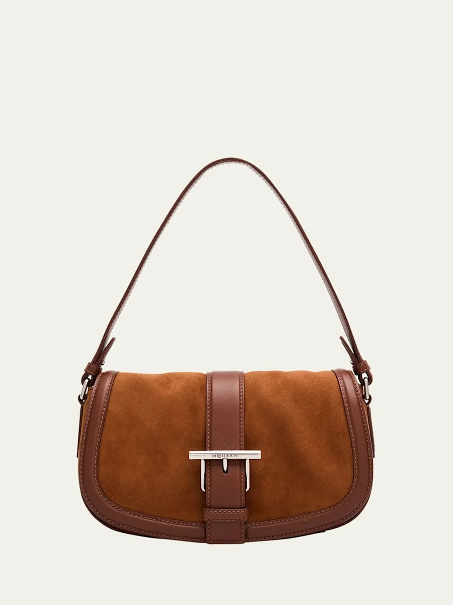 McQueen "T-Bar" saddle crossbody bag in suede and leather Adjustable crossbody strap Flap top with T-bar snap closure Approx. 6.2"H x 10.6"W x 2.7"D Made in Italy Online Inquiries: BGS21_V6GUD| Store Inquiries: #4986562