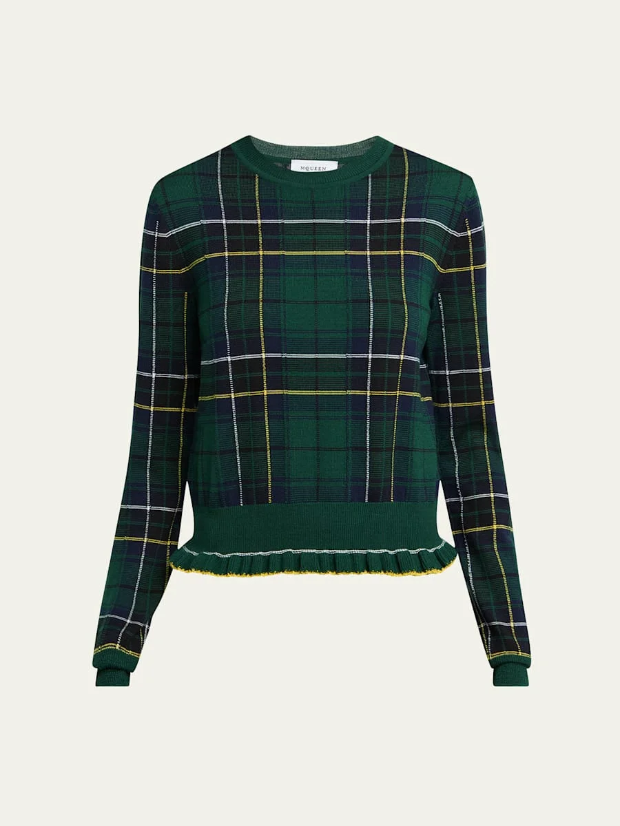 McQueen sweater featuring a tartan intarsia and a ruffled hem Crew neckline Long sleeve with ribbed cuffs Slim fit Hip length Pullover style Wool Made in Italy