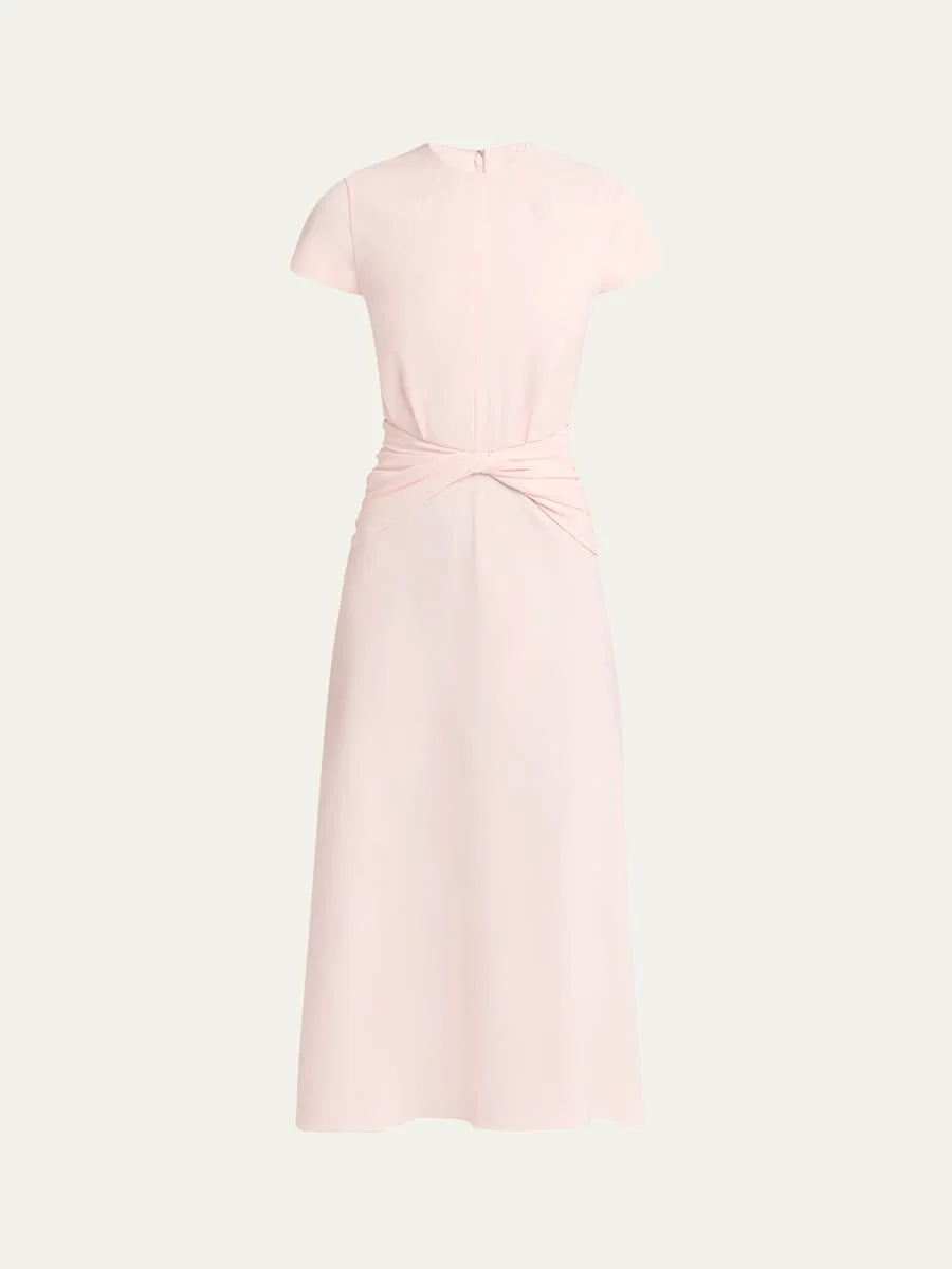 McQueen dress featuring a twisted waist detail Round neckline Short sleeves Hem falls below the knee A-line silhouette Back zip Acetate/silk/viscose Made in Italy Online Inquiries: BGS21_BA7RN| Store Inquiries: #5046798