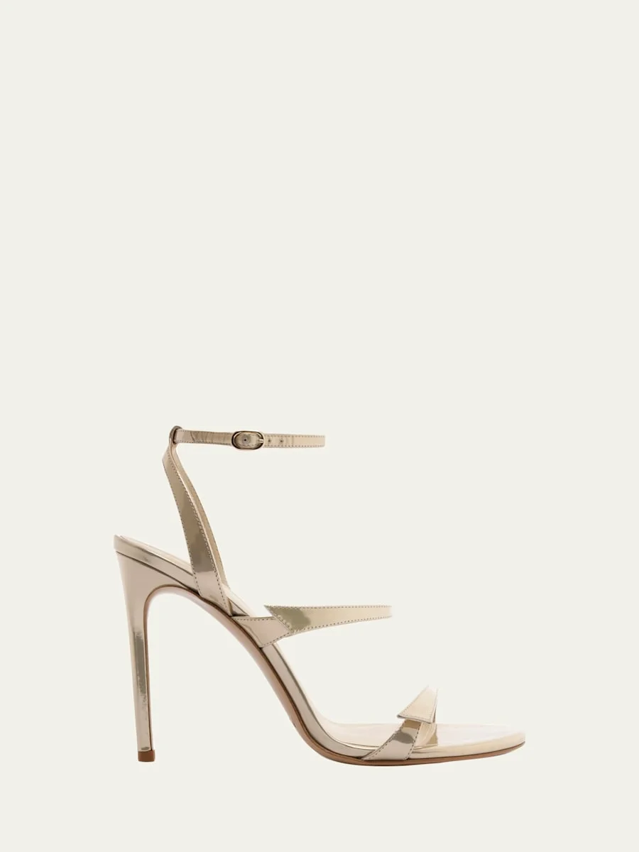 Alexandre Birman "Tita" sandals in metallic calfskin leather 4.00 in / 100 mm stiletto heel Round open toe Adjustable buckle ankle strap Leather lining and outsole Made in Italy