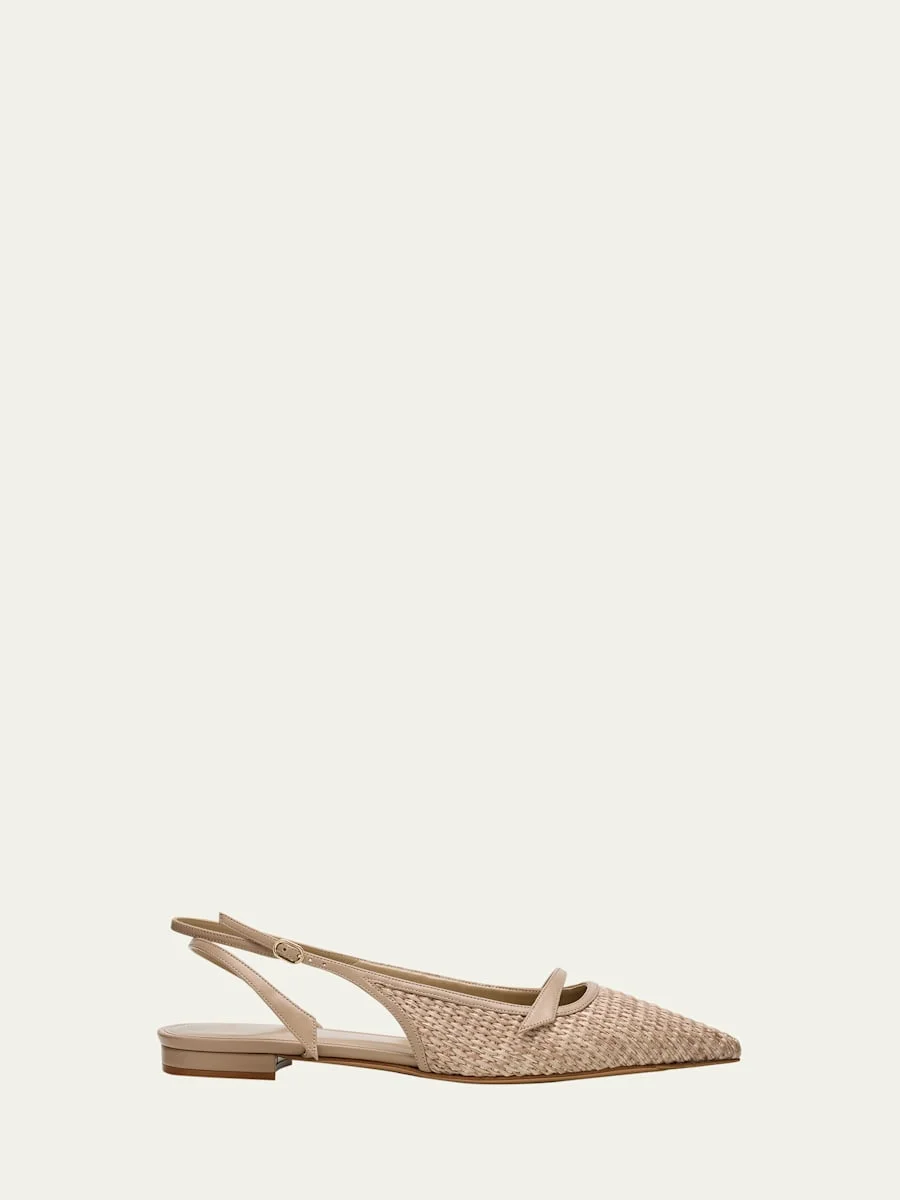 Alexandre Birman "Tita" ballerina flats in woven raffia with smooth leather trim 0.50 in / 15 mm flat heel Pointed toe Buckle ankle strap Leather lining and outsole Professional cleaning recommended Made in Italy Online Inquiries: BGS21_X6USJ| Store Inquiries: #4979961