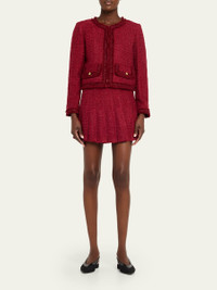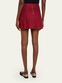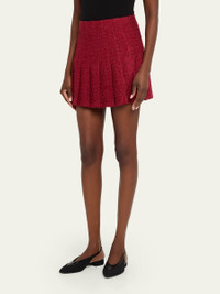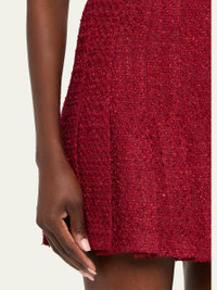 Crafted in a rich red tweed, the "Carter" mini skirt by Alice + Olivia features sparkly threads woven throughout with a pleated hem High rise A-line silhouette Hem falls above the knee Center back zip Acrylic/polyester/wool Lining: Recycled polyester Dry clean Imported Online Inquiries: BGS21_T8RFW| Store Inquiries: #5368401
