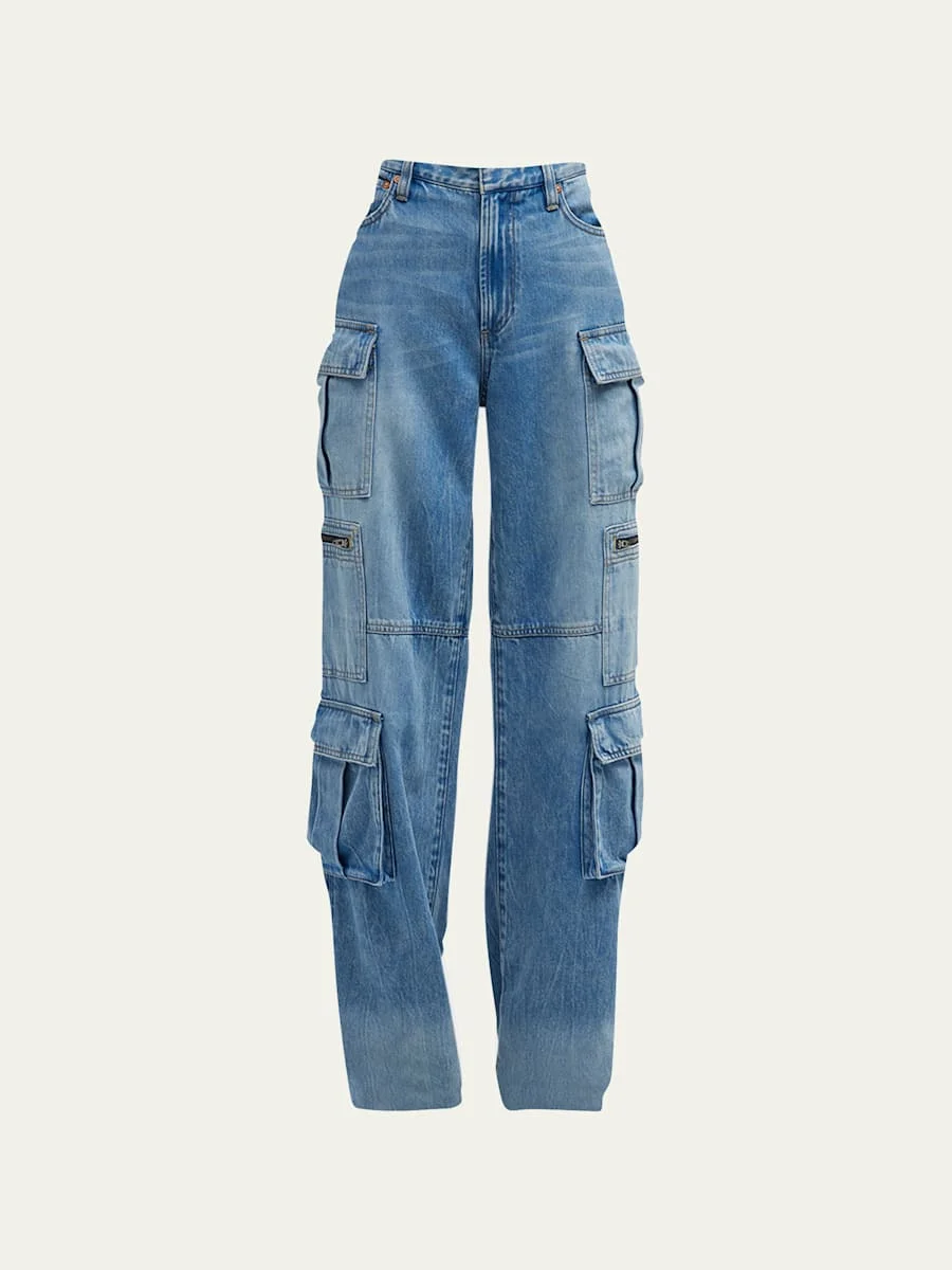 Alice + Olivia "Cay" baggy denim cargo pants Approx. 15.5" rise; 34.5" inseam Five-pocket style; cargo leg flap and zip pockets Low rise Wide legs Full length Button/zip fly; belt loops Cotton/elastane Lining: Cotton Dry clean Imported Model is 5'10"/177cm. Online Inquiries: BGS21_T4CT3| Store Inquiries: #4466046