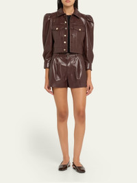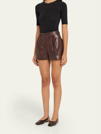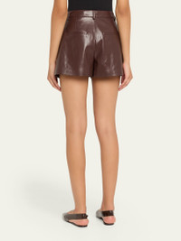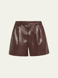 A tailored trouserstyle silhouette, the "Conry" shorts by Alice + Olivia are crafted from smooth vegan leather (PU/polyester) with flattering front pleating Approx. 2.6" inseam High waist Side seam pockets Back welt pockets Relaxed legs Button/zip fly; belt loops Polyurethane/polyester Lining: Recycled polyester Dry clean Imported