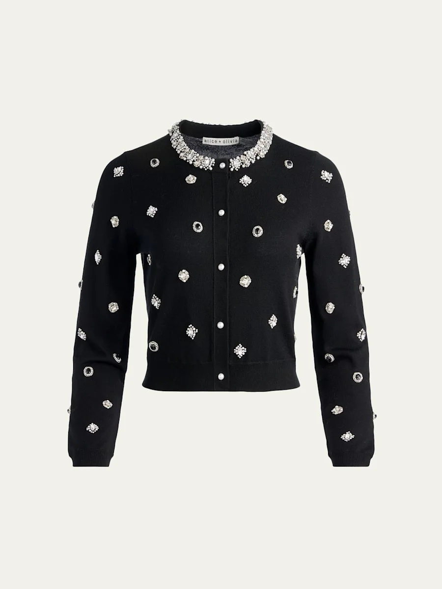 Knit from cozy wool with a hint of stretch, the "Dollie" cardigan by Alice + Olivia is embellished with faux pearl detailing for an effortlessly polished look Approx. 18.5"L from shoulder to hem Crew neckline Long sleeves Slim fit Cropped hem Button front closure Wool/elastane Unlined Imported Online Inquiries: BGS21_T8VNW| Store Inquiries: #5449290