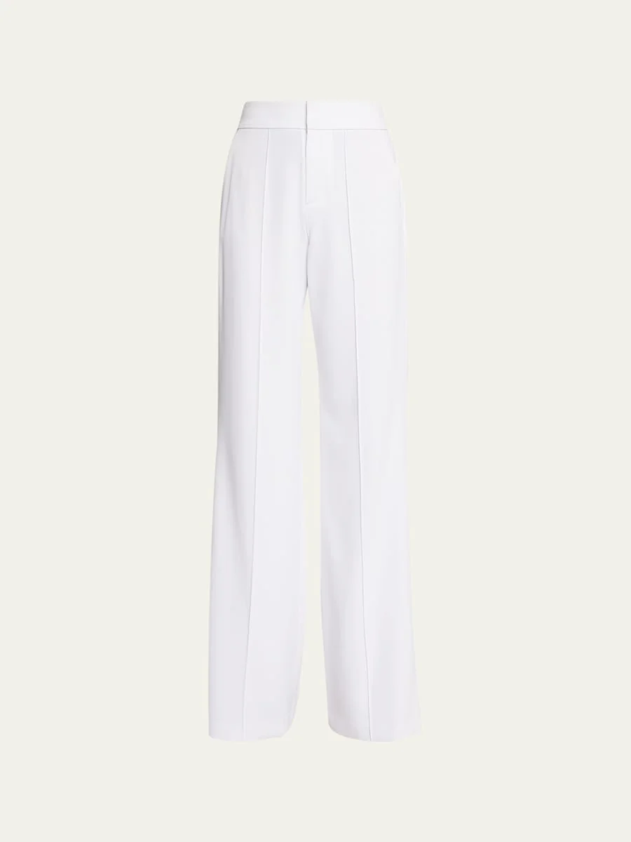 Alice + Olivia "Dylan" pants. Approx. measurements: 9.5" rise; 34" inseam; 45" outseam. High-rise. Wide, flared legs. Back welt pockets. Full length. Hook/zip fly. Polyester; lining, polyester/spandex. Dry clean. Imported. Model is 5'10"/177cm. Online Inquiries: BGS21_T10YQ| Store Inquiries: #2675107
