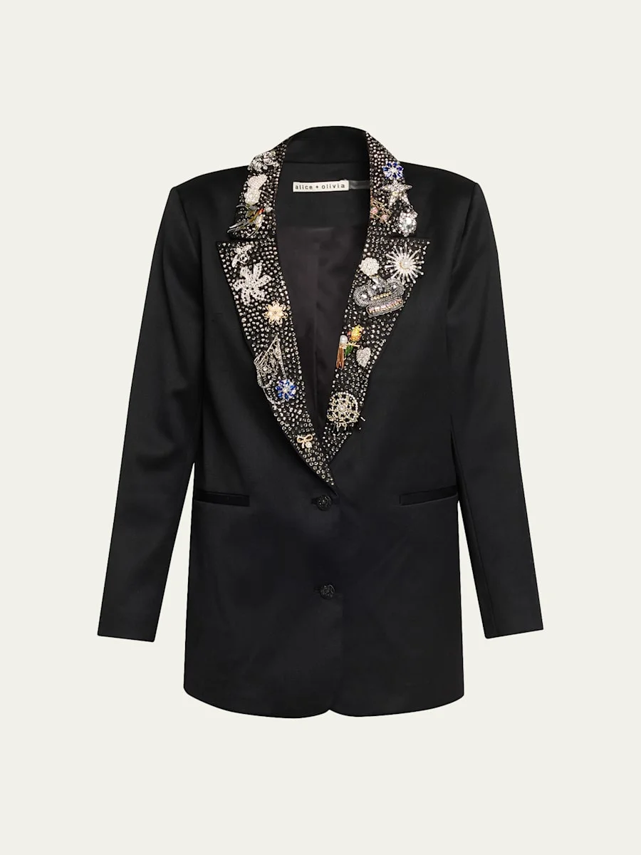 The "Elna" blazer by Alice + Olivia is crafted from wool satin and embellished with intricate beadwork and crystal brooches along the lapels for a dazzling finish Approx. 29.5"L from shoulder to hem Notched lapels; single-breasted front Strong shoulders Long sleeves; button cuffs Hip welt pockets Center-cut back vent Oversized fit Mid-length Wool/polyurethane Lining: Recycled polyester Imported Online Inquiries: BGS21_T7KCP| Store Inquiries: #5173411