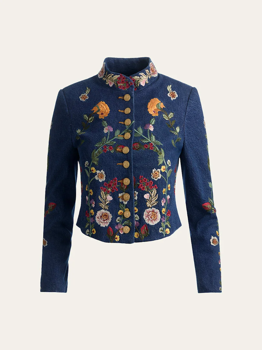 Inspired by classic utilitarian styling, the "Emerson" military jacket by Alice + Olivia is designed in darkwash denim with intricate mixed floral embroidery Approx. 18"L from shoulder to hem Mock neckline Long sleeves; button cuffs Slim fit Cropped hem Button front closure Cotton/elastane Lining: Recycled polyester Dry clean Imported