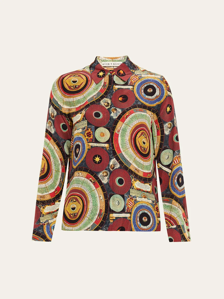 Made from silk crepe de chine, the "Willa" blouse by Alice + Olivia is illustrated with intricate Hands of Time print Approx. 24"L from shoulder to hem Crisp shirt collar; hidden placket Long sleeves with button cuffs; approx. 31.3"L Yoked back Relaxed fit Hip length Silk Unlined Dry clean Imported Online Inquiries: BGS21_T8T4K| Store Inquiries: #5427630