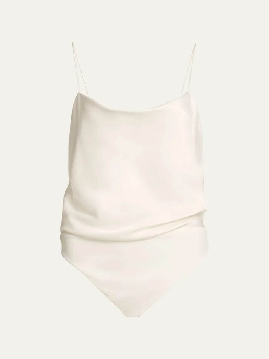 Alice + Olivia "Harmon" bodysuit. Approx. 29"L from shoulder to hem. Cowl neckline. Spaghetti straps. Exposed back zipper. Thong back. Triacetate/polyester; combo, polyester/spandex. Lining A, nylon/spandex; lining B, polyester/spandex. Imported. Online Inquiries: BGS21_I1U5F| Store Inquiries: #3209140