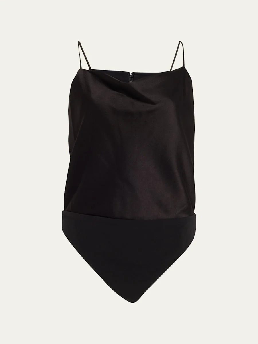 Alice + Olivia "Harmon" bodysuit. Approx. 29"L from shoulder to hem. Cowl neckline. Spaghetti straps. Exposed back zipper. Thong back. Triacetate/polyester; combo, polyester/spandex. Lining A, nylon/spandex; lining B, polyester/spandex. Imported. Online Inquiries: BGS21_I1U5F| Store Inquiries: #3209140