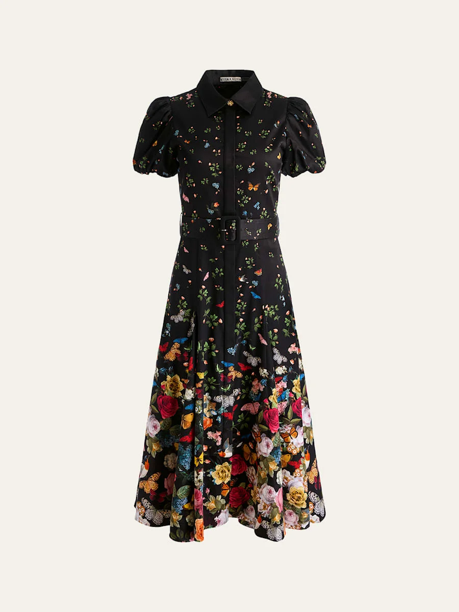 Crafted from printed cotton sateen, the "Henrietta" shirtdress by Alice + Olivia features a belted waist and a full skirt for a flattering, structured silhouette Approx. 49"L from shoulder to hem Shirt collar; concealed button front Short puff sleeves; elastic cuffs Adjustable belt Hem falls below the knee Aline silhouette Cotton/elastane Lining: Polyester Dry clean Imported