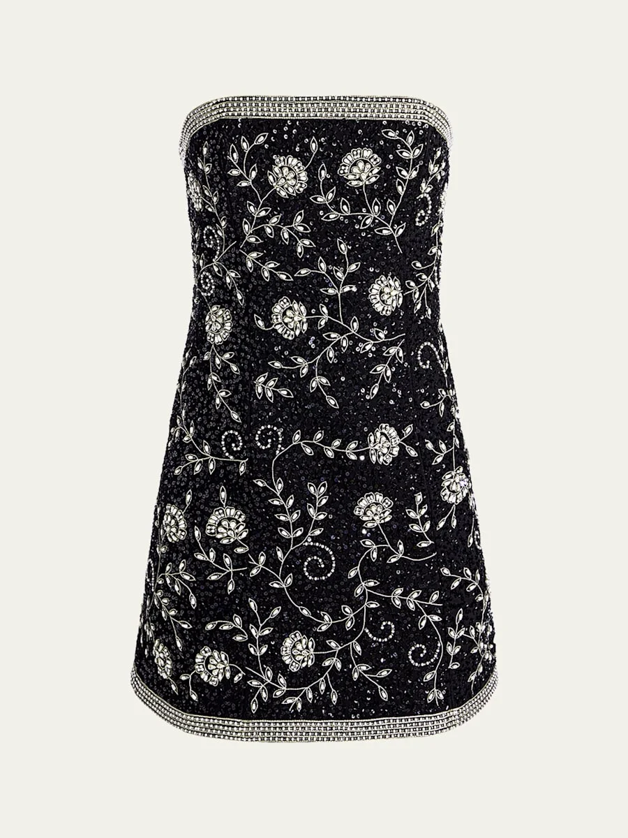 The "Katia" sequinembellished dress by Alice + Olivia features an intricate crystal floral design and matching trim Approx. 32.8"L from shoulder to hem Strapless neckline Sleeveless Hem falls above the knee Aline silhouette Invisible back zipper Polyester Lining: Recycled polyester Dry clean Imported