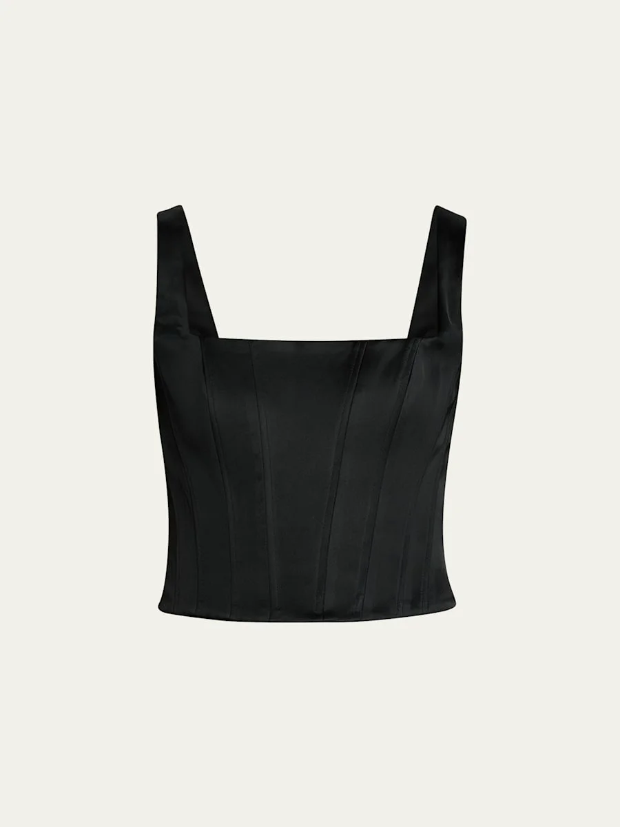 Crafted from heavyweight stretch satin, Alice + Olivia's "Lilianna" corsetstyle top is designed with inner boning to sculpt the bodice Faceframing square neckline Sleeveless Slim fit Cropped length Center back zipper Acetate/nylon/polyamide/elastane Imported