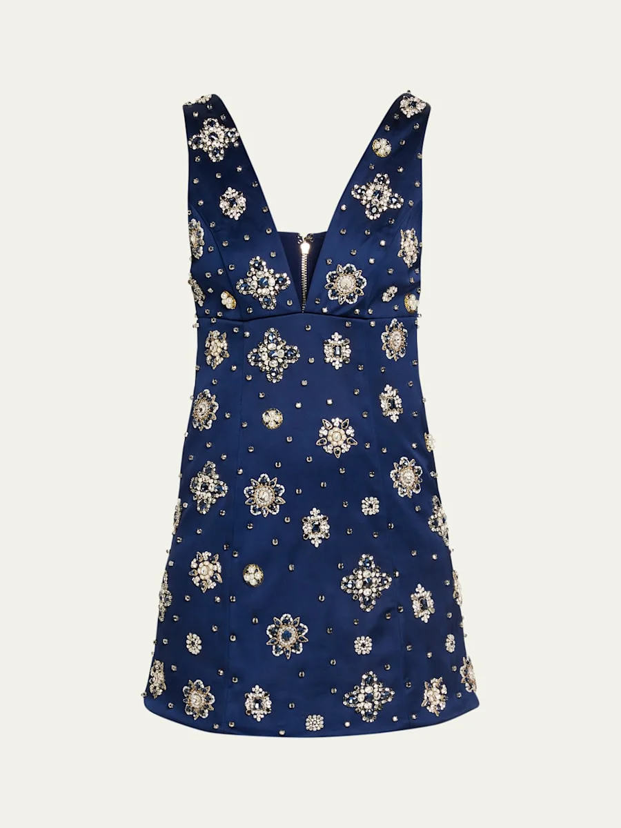 Alice + Olivia's "Mandy" structured mini dress is embellished with floral motifs Approx. 33"L from shoulder to hem Plunging V neckline Sleeveless Hem falls above the knee Bodyskimming silhouette Center back zipper Acetate/nylon/polyamide/elastane Lining: Recycled polyester Dry clean Imported
