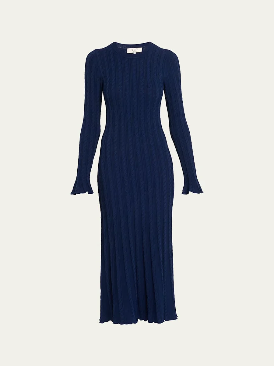 Alice + Olivia's "Rhea" dress is finished with textural cableknit detailing and lettuce trim Round neckline Long sleeves Hem falls below the knee Bodyskimming silhouette Slipover style Wool/polyurethane Dry clean Imported