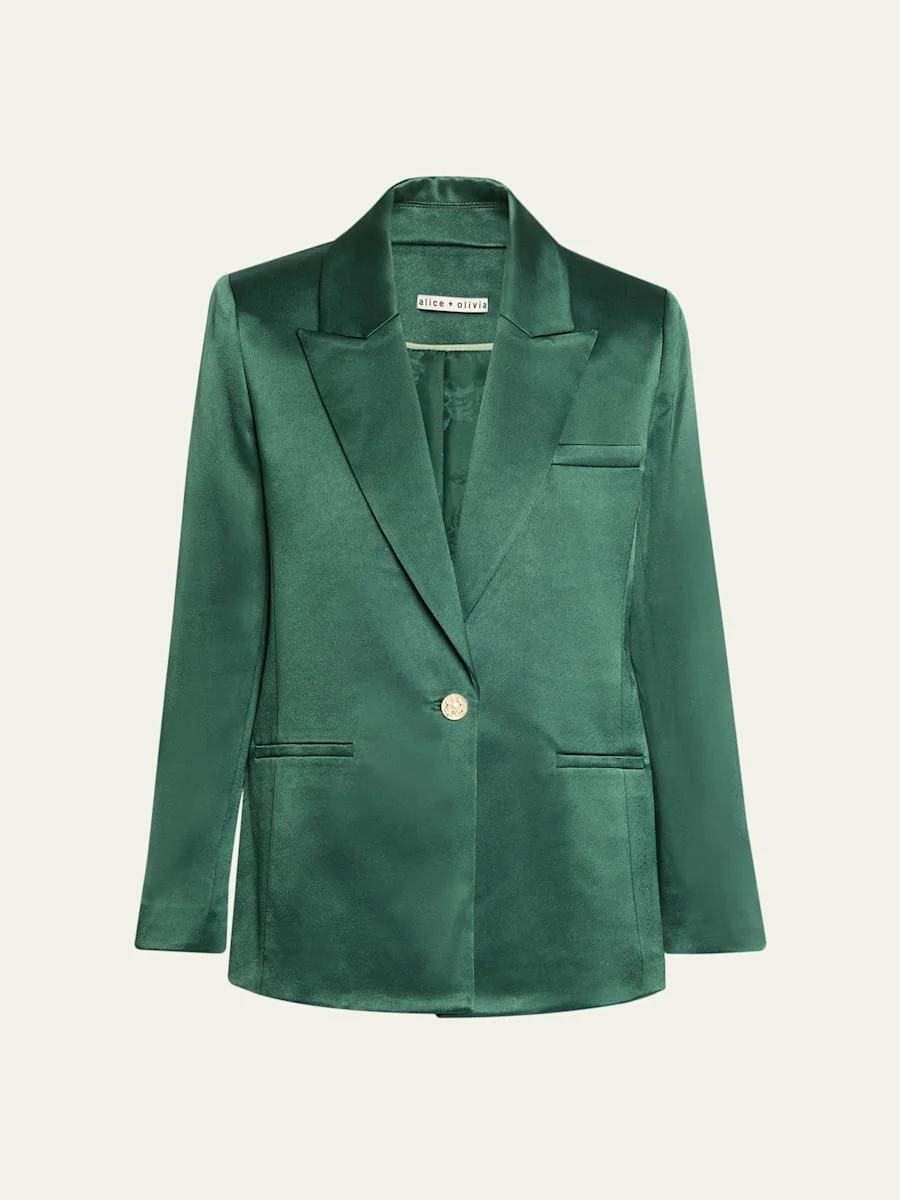 Cut from lustrous satin, the "Silas" blazer by Alice + Olivia is expertly tailored with strong shoulders to create the perfect polished top layer Approx. 28"L from shoulder to hem Peak lapels; single-breasted front Long sleeves with button cuffs; approx. 32.5"L Chest welt pocket Hip welt pockets Mid-length Triacetate/polyester Lining: Polyester Dry clean Imported Online Inquiries: BGS21_T8RFM| Store Inquiries: #5368387
