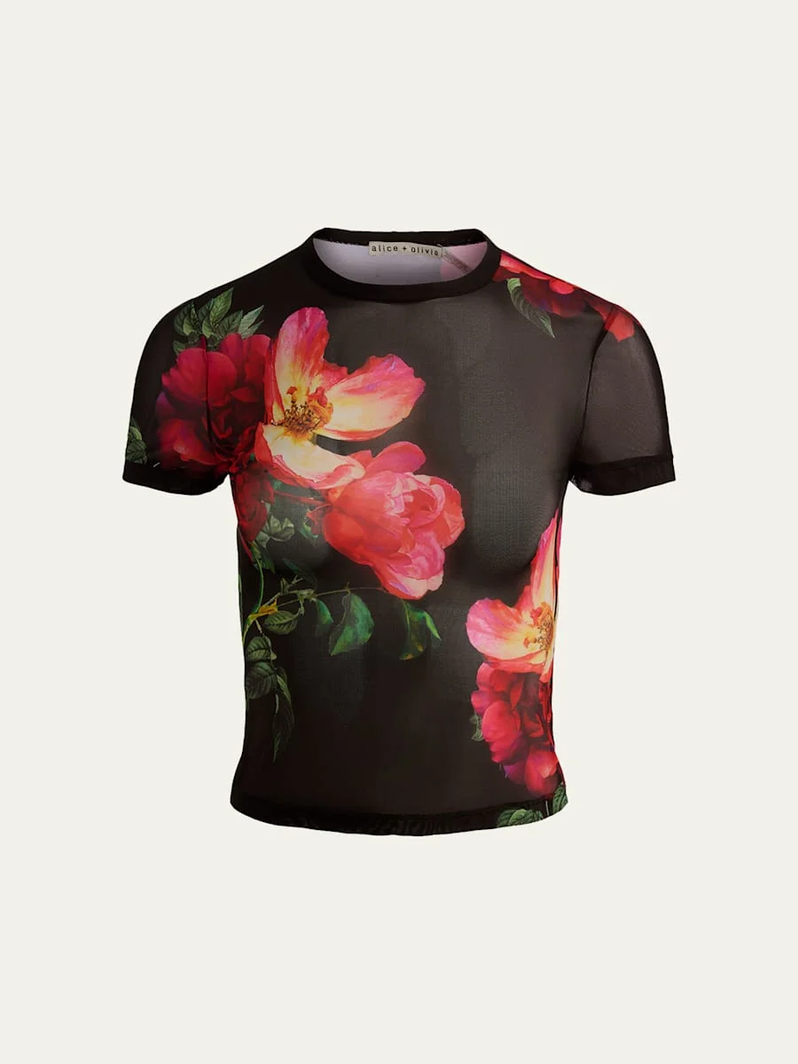 Crafted from sheer mesh, the "Tess" tee from Alice + Olivia is illustrated with eyecatching floral motifs Approx. 19.3"L from shoulder to hem Crew neckline Short sleeves Slim fit Cropped hem Pullover style Polyester/elastane Unlined Dry clean Imported