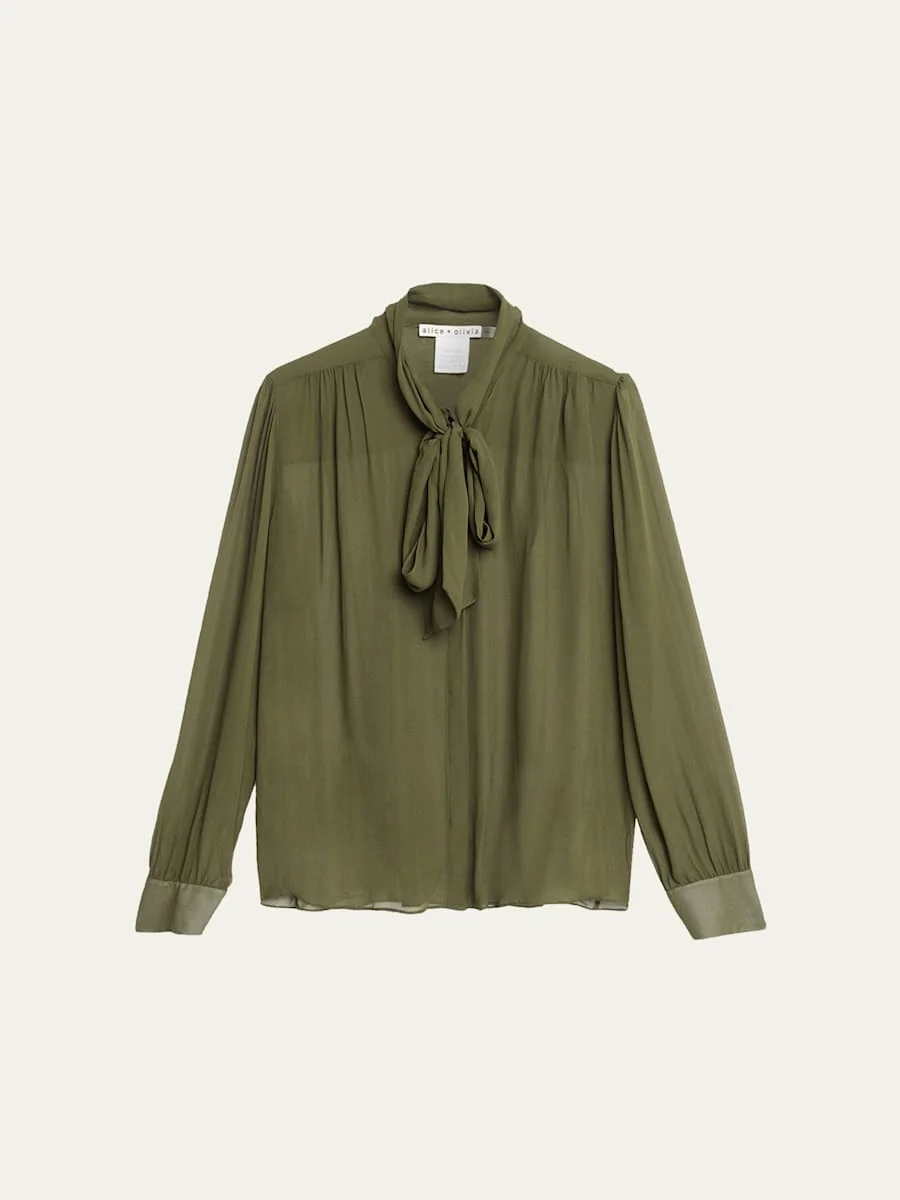 The "Thayer" blouse by Alice + Olivia is crafted from a sheer fabrication with delicate gathering Approx. 26"L from shoulder to hem High selftie neckline Long sleeves with button cuffs; approx. 32"L Yoked back Relaxed fit Hip length Concealed button front closure Viscose Unlined Dry clean Imported