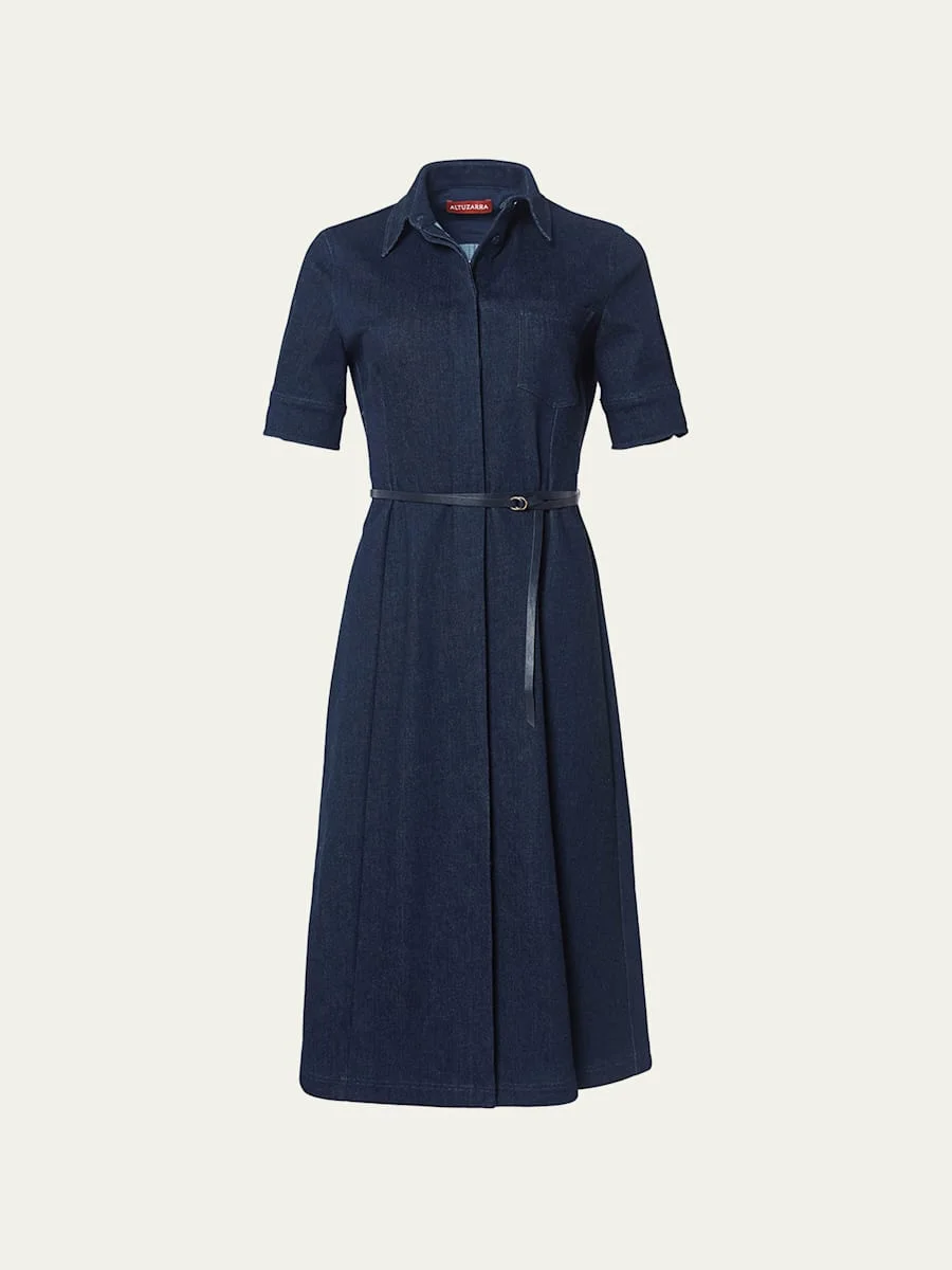 Kieran Denim Leather Belted Midi Dress