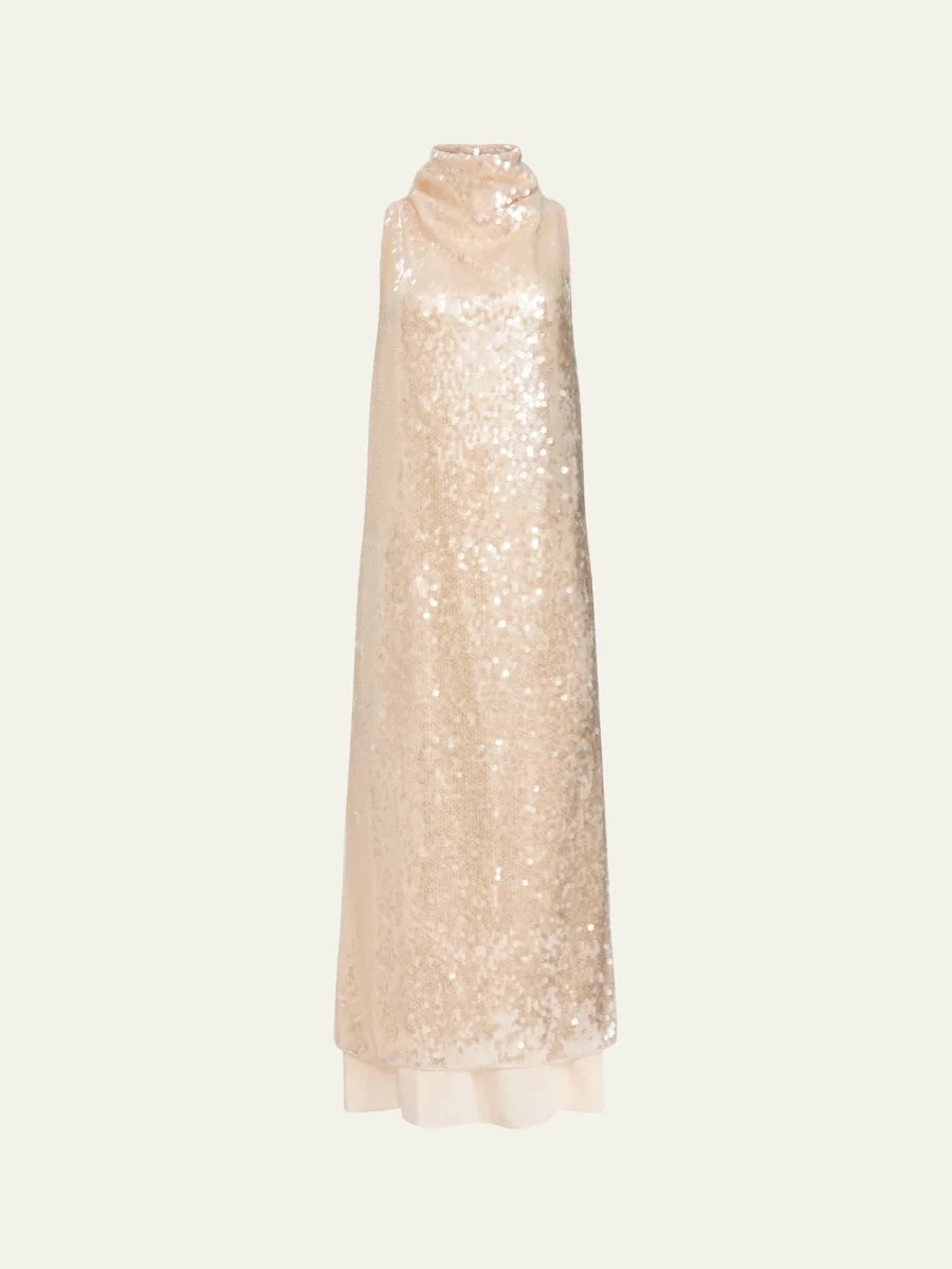 The "Noor" evening gown by Altuzarra is adorned with glittering sequins on a tulle backdrop and punctuated by a contrasting hem High neckline Sleeveless Full length Column silhouette Back keyhole cutout/hook closure Polyester/nylon/polyamide/metal Dry clean Made in Italy