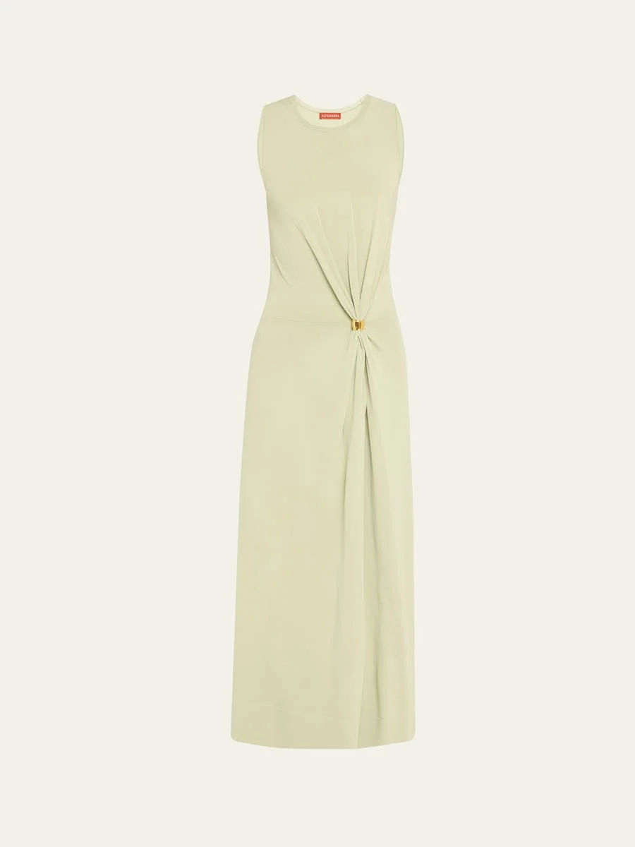 Altuzarra "Saralien" dress featuring waist gathering with a goldtone ring detail Round neckline Sleeveless Sheath silhouette Full length Slipover style Viscose/nylon/polyamide Dry clean Imported Online Inquiries: BGS21_BA31M| Store Inquiries: #5022457