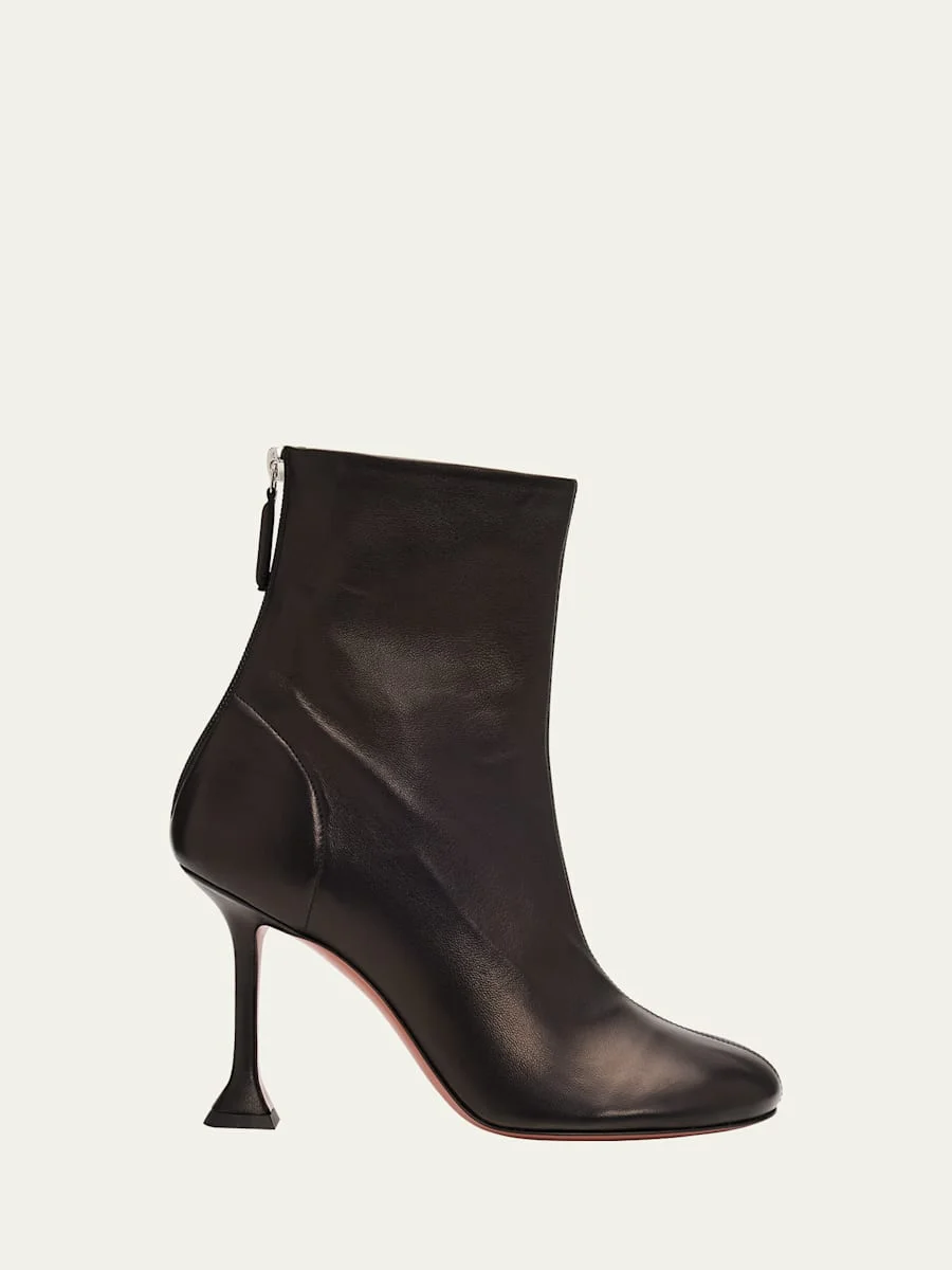 The "Iris" booties by Amina Muaddi are crafted from buttery soft lambskin leather 3.75 in / 95 mm exaggerated pedestal stiletto heel Rounded toe Back zip closure Goat leather lining Leather outsole Made in Italy