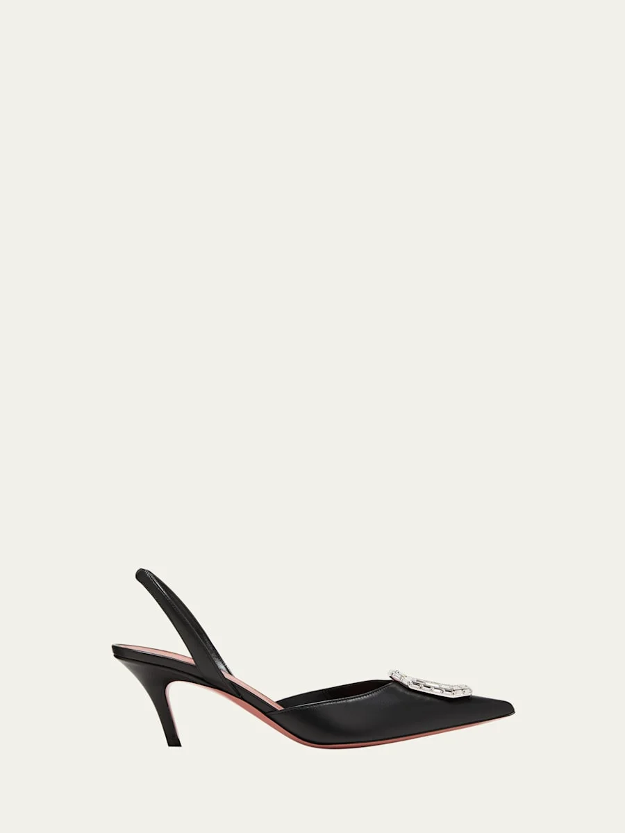 Amina Muaddi "Camelia" smooth leather pumps with crystal ornament 2.36 in / 60 mm kitten heel Pointed toe Halter slingback strap Leather lining Leather outsole Made in Italy Online Inquiries: BGS21_X669X| Store Inquiries: #4584771