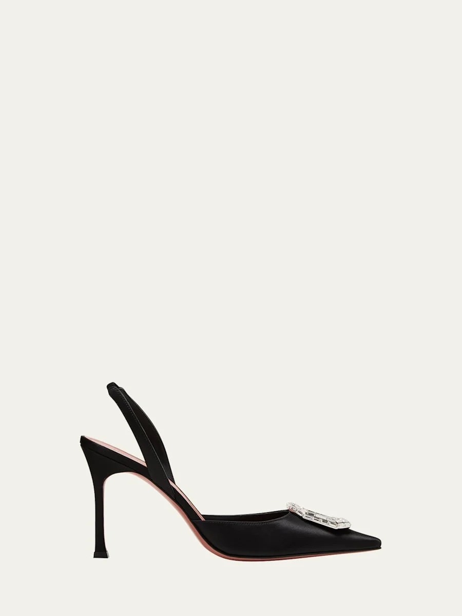Amina Muaddi "Camelia" silk pumps with crystal ornament 3.50 in / 90 mm stiletto heel Pointed toe Halter slingback strap Leather lining Leather outsole Made in Italy Online Inquiries: BGS21_X6CTQ| Store Inquiries: #4671409