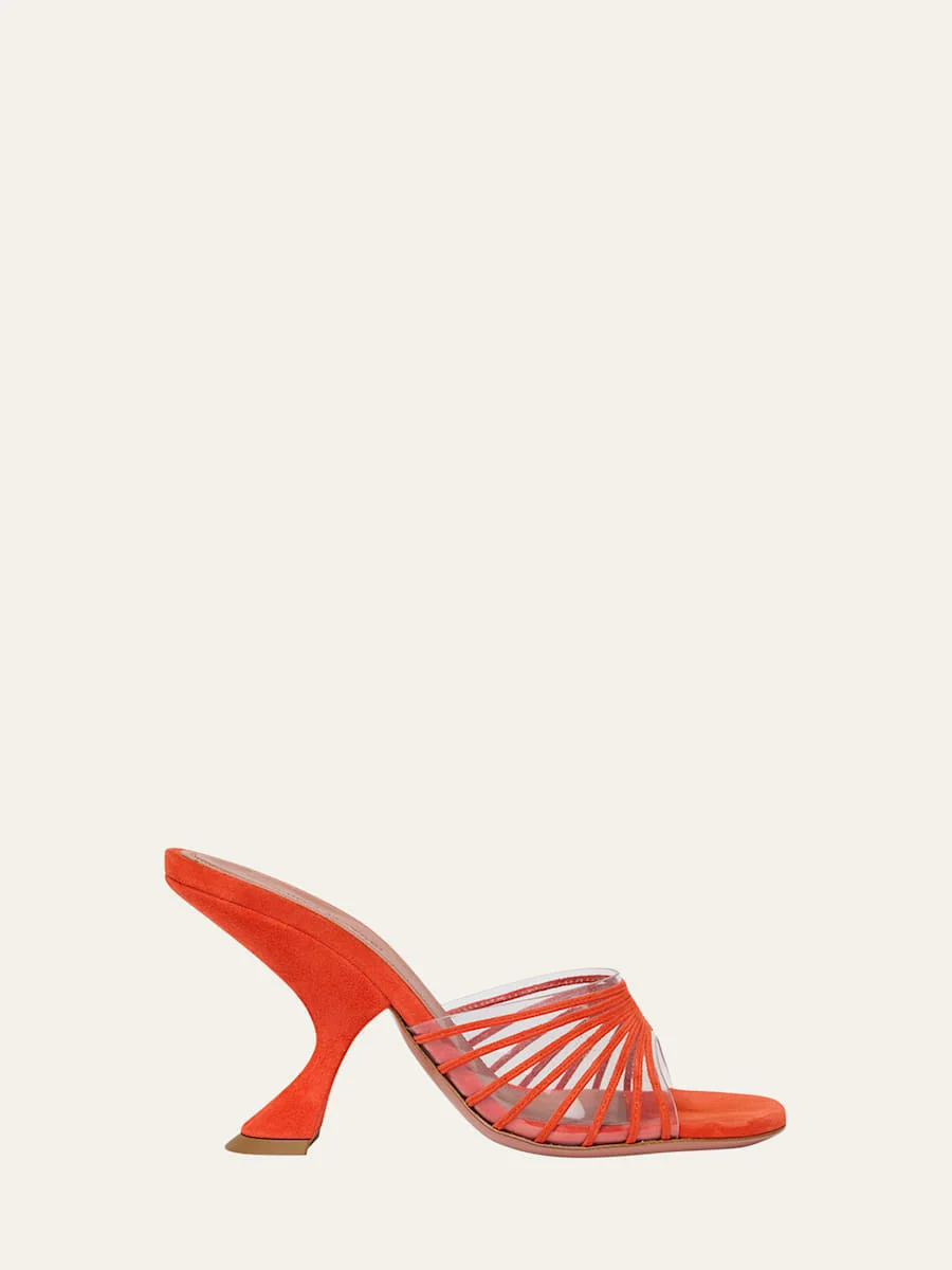 Amina Muaddi "Mookie" mules in goat suede and PVC 3.50 in / 90 mm architectural heel Open toe Single strap vamp with cage effect Easy slip-on style Leather/Rubber outsole Lining: Goat leather Made in Italy Online Inquiries: BGS21_X6VVB| Store Inquiries: #5007063