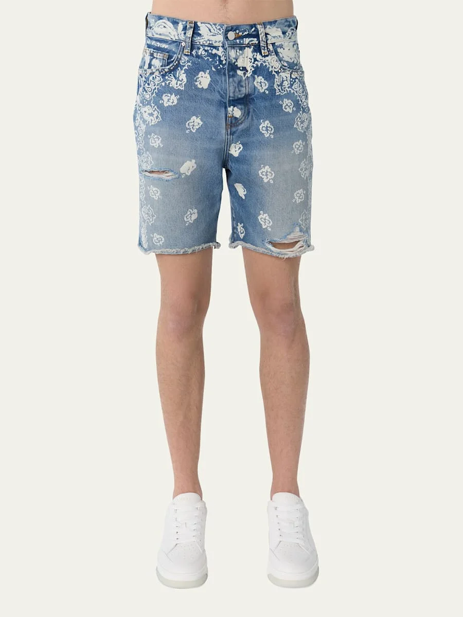 Amiri distressed denim shorts with bleached bandana motif Regular rise Five-pocket style Straight legs Button closure/zip fly; belt loops Cotton Made in USA from imported materials Model is 6'1"/185cm. Online Inquiries: BGS21_NEUJW| Store Inquiries: #4357074