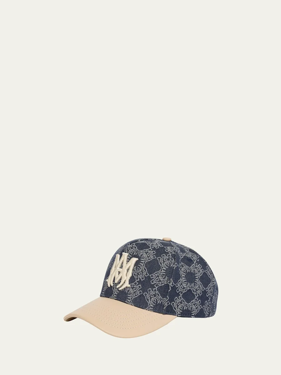 Amiri baseball cap in MA quad denim showcasing a raised embroidered MA logo on the front Top button Embroidered eyelets Curved stitched leather brim Adjustable back strap Leather logo patch Cotton/leather Made in USA from imported materials Online Inquiries: BGS21_NDL3S| Store Inquiries: #5043691