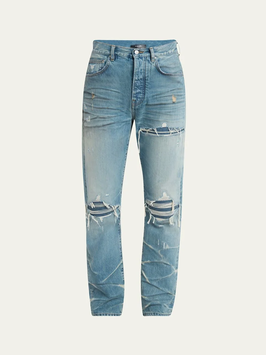 Amiri "MX1" jeans in destroyed medium-wash denim Regular rise Five-pocket style Fitted through straight legs Button/zip fly; belt loops Cotton Dry clean Made in Italy Online Inquiries: BGS21_NDDF2| Store Inquiries: #5028247