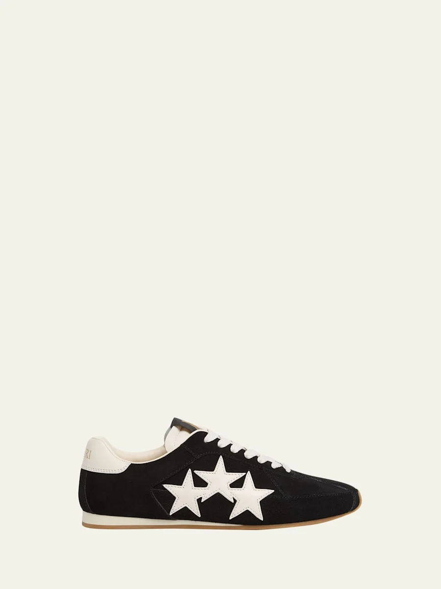 The "Pacific Flat" lowtop sneaker by Amiri is a new house icon inspired by timehonored athletic sneakers and designed in a low, streamlined profile. Crafted of suede and leather, it features the house's signature threestar leather applique on the side. Flat heel Round toe Laceup vamp Monogram logo woven label on the tongue Rubber outsole Spot clean Imported
