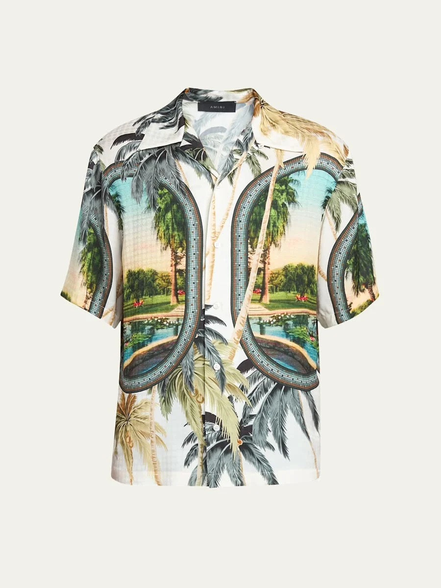 Amiri bowling shirt boasts a Paradise print Notched collar; button-placket Short sleeves Relaxed fit Viscose Dry clean Made in Italy Online Inquiries: BGS21_NDDEV| Store Inquiries: #5028240