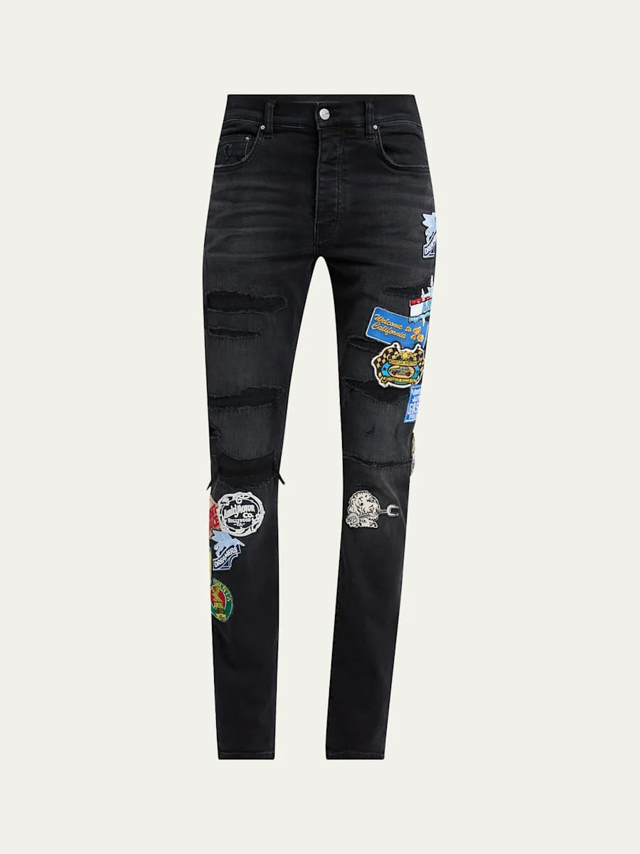 Amiri distressed jeans embellished with patchwork Regular rise Five-pocket style Fitted through slim legs Button/zip fly; belt loops Cotton/elastane Dry clean Made in Italy Online Inquiries: BGS21_ND53K| Store Inquiries: #5025196