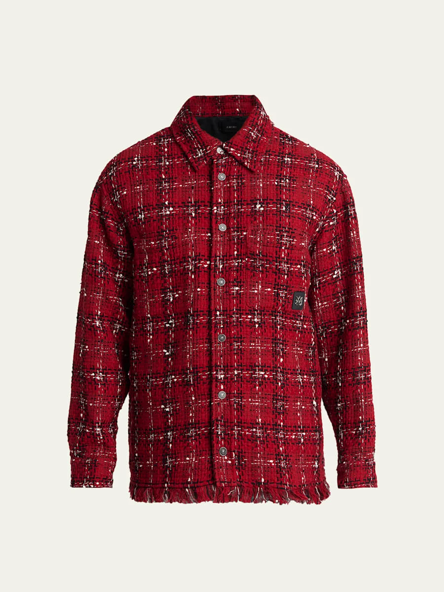This plaid overshirt from Amiri is crafted from tweed flannel for depth and texture. Point collar Snap placket MA logo patch Singlesnap cuffs Fringe hem Relaxed fit Cotton/virgin wool/nylon/polyamide Made in Italy