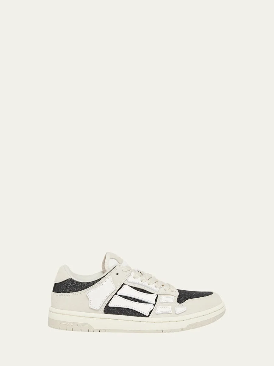 Amiri contrast shimmer and matte leather low-top sneakers with skeleton bones applique Flat heel Perforated round toe Lace-up vamp with logo accent Lining: Polyester Rubber outsole Imported Online Inquiries: BGS21_X6TKD| Store Inquiries: #4963226
