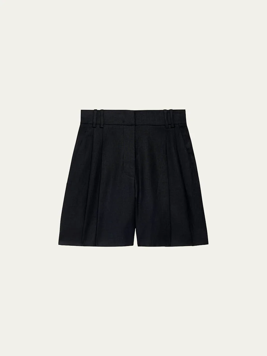 Another Tomorrow featherweight pleated front shorts Approx. 7" inseam Side slip pockets; back buttoned pockets Mid-thigh length Wide legs Tab/zip fly; belt loops Linen Viscose lining Dry clean Made in Italy Model is 5'10"/177cm. Online Inquiries: BGS21_B92AK| Store Inquiries: #4727295