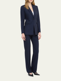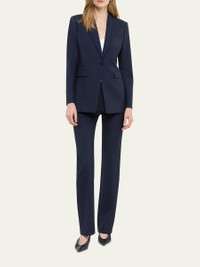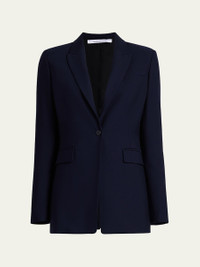 Another Tomorrow single button blazer jacket with a nipped waist and merino wool finish Approx. 29.4" from shoulder to hem Peak lapel collar Long sleeves Side flap pockets; front welt pocket Mid-length Relaxed fit Seasonless custom-made merino wool Lining: Cupro Made in Italy Model is 5'10"/177cm. Online Inquiries: BGS21_BB80H| Store Inquiries: #4449768