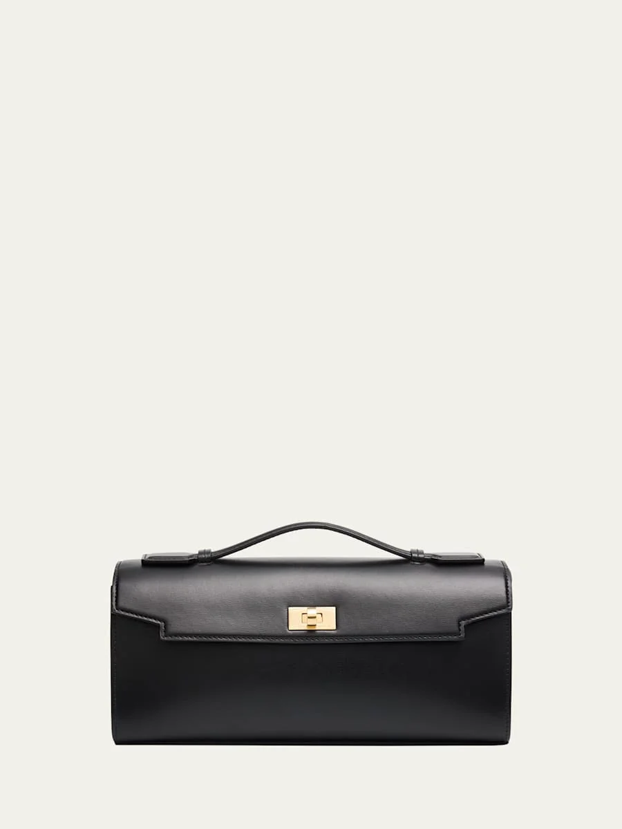 This "Mortimer" clutch bag from Anya Hindmarch is handcrafted in glossy box calf leather, finished with clean lines and a rounded silhouette Flat top handle Detachable leather shoulder strap Can be worn as a clutch, top-handle, or shoulder bag Flap top with turn-lock closure Interior, two slip pockets, one mirror slot with gold-tone metal mirror Red satin leather lining Approx. 5.1"H x 10.2"W x 2.8"D Wipe clean Made in Italy Online Inquiries: BGS21_V6P0K| Store Inquiries: #5079597