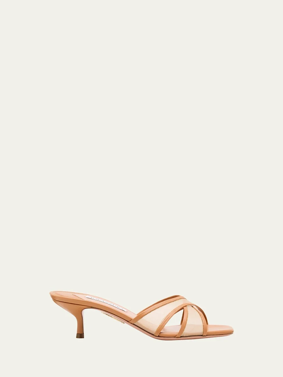 Aquazzura "Divine" mule sandals in sheer nylon mesh and leather 2.00 in / 50 mm kitten heel Open toe Crisscross vamp Slide style Leather outsole Lining: Goat leather Imported Online Inquiries: BGS21_X6W1P| Store Inquiries: #5012563
