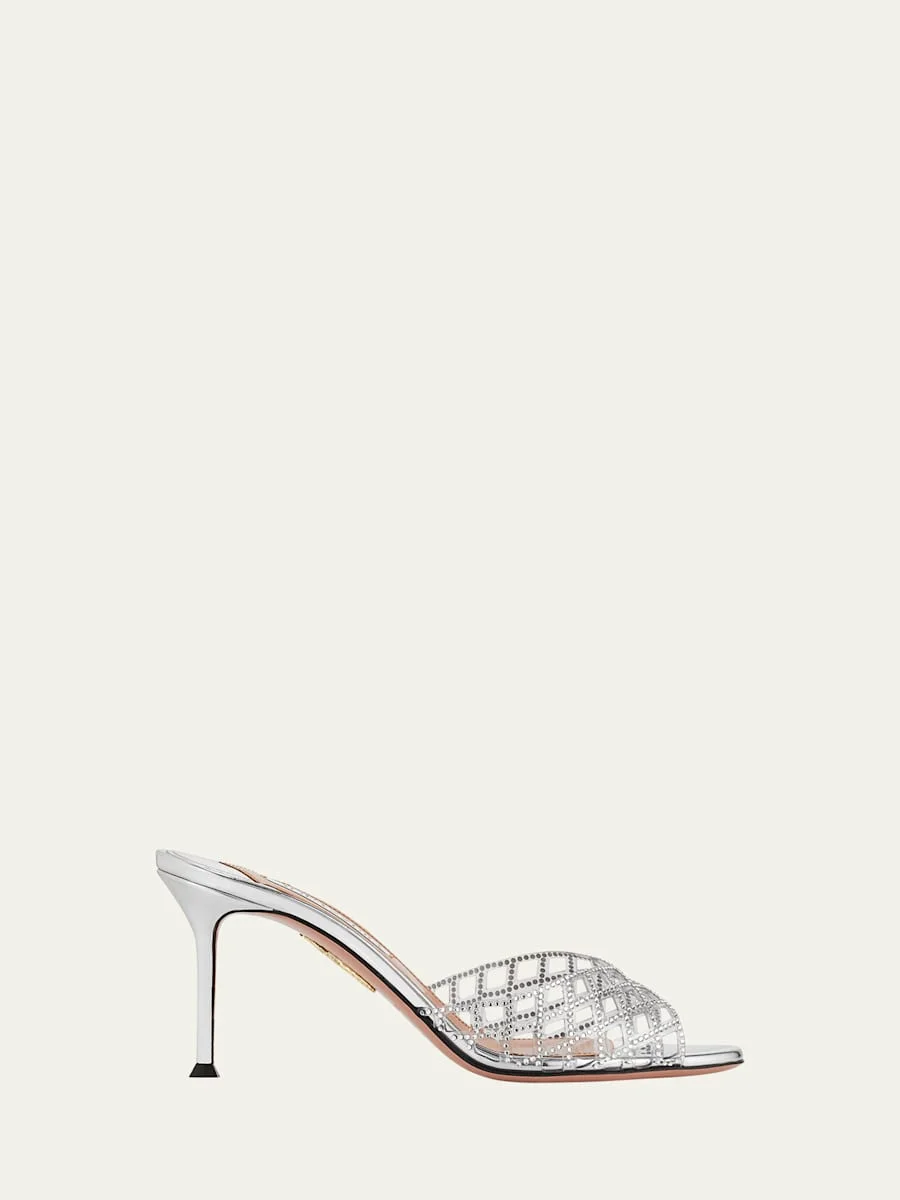 Aquazzura evening mule sandals in shimmery crystal-embellished PVC with metallic leather trim 2.75 in / 70 mm stiletto heel Open toe Slip-on style Leather outsole Lining: Goat leather Made in France Online Inquiries: BGS21_X6W1Q| Store Inquiries: #5012564