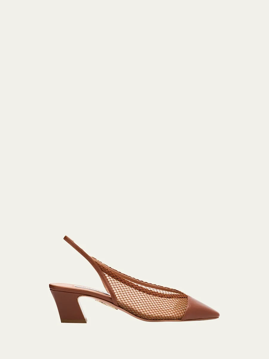 Aquazzura ballerina pumps in nylon mesh net and tonal leather Square cap toe 2.00 in / 50 mm block heel Stretch slingback strap Leather outsole Lining: Goat leather Imported Online Inquiries: BGS21_X6W1R| Store Inquiries: #5012565