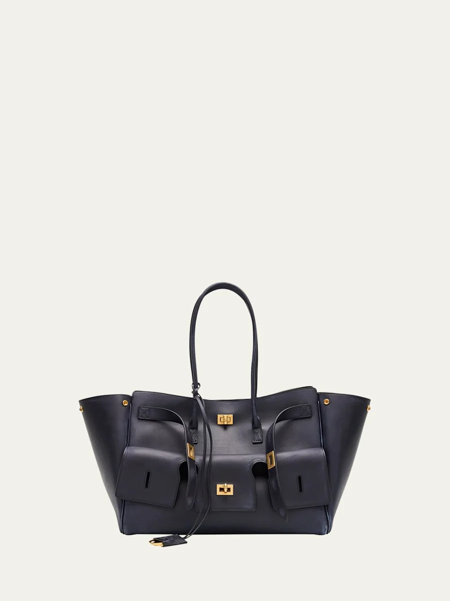 Balenciaga "Bel Air" medium tote bag crafted in smooth calfskin leather with strappy details Rolled top handles, 7.8" drop Can be worn as a top handle or shoulder bag Removable leather key holder with two split rings Open top with turn-lock closure Gusseted sides with snaps Exterior, one flap pocket with turn-lock closure Interior, two zip pockets and two slip pockets Nappa lambskin leather bonded lining Approx. 11"H x 14.5"W x 6.7"D Made in Italy Online Inquiries: BGS21_V6MD2| Store Inquiries: #5057993